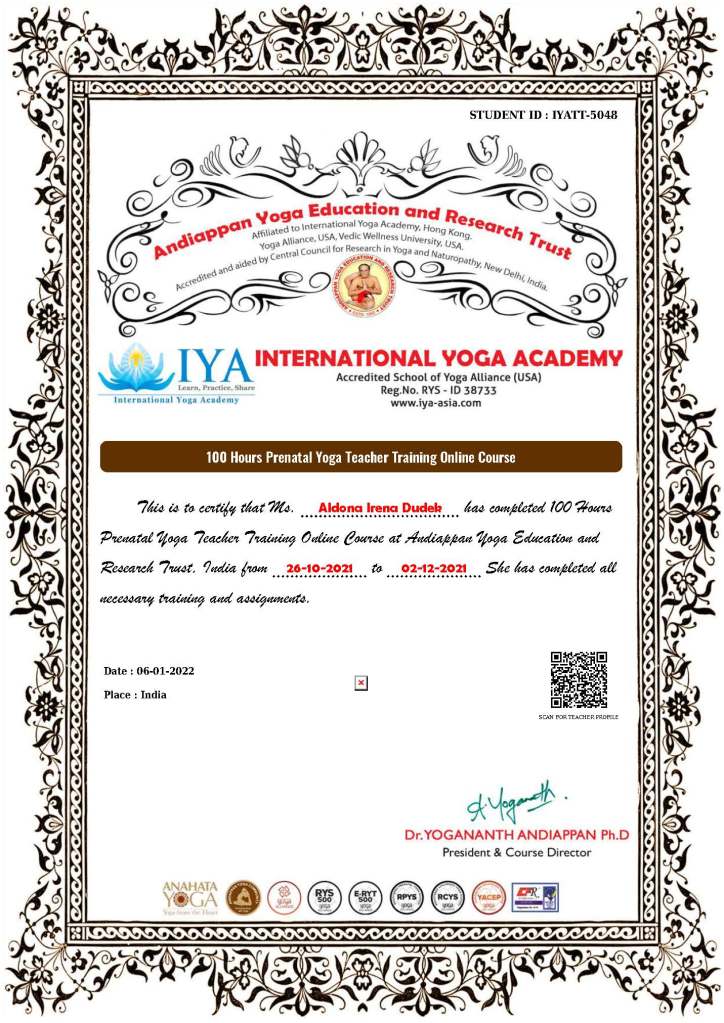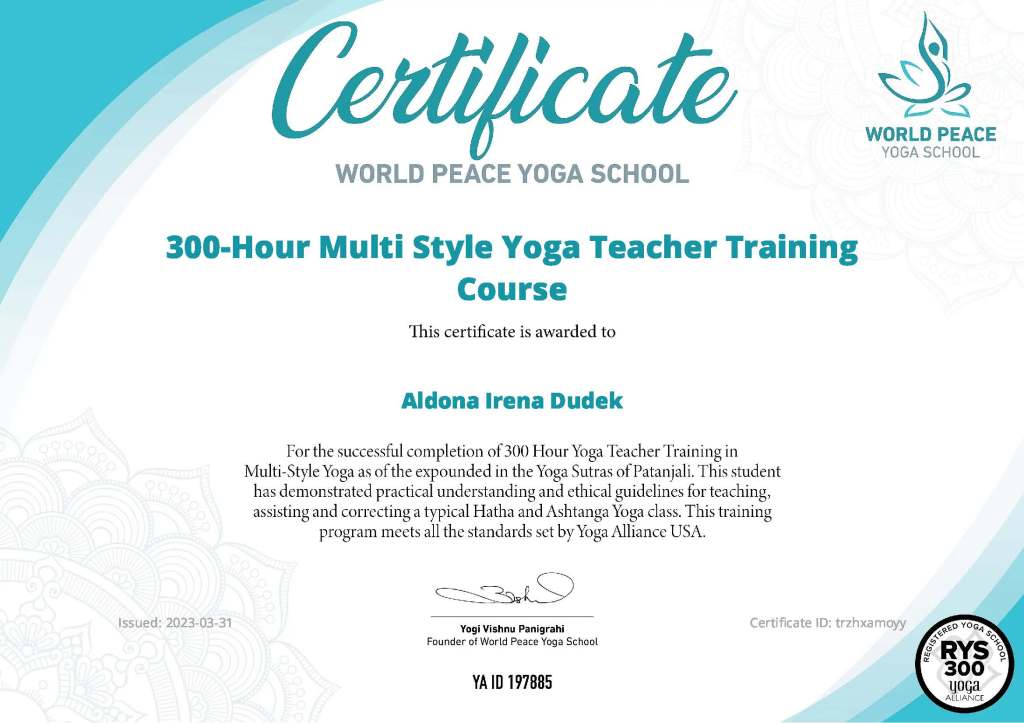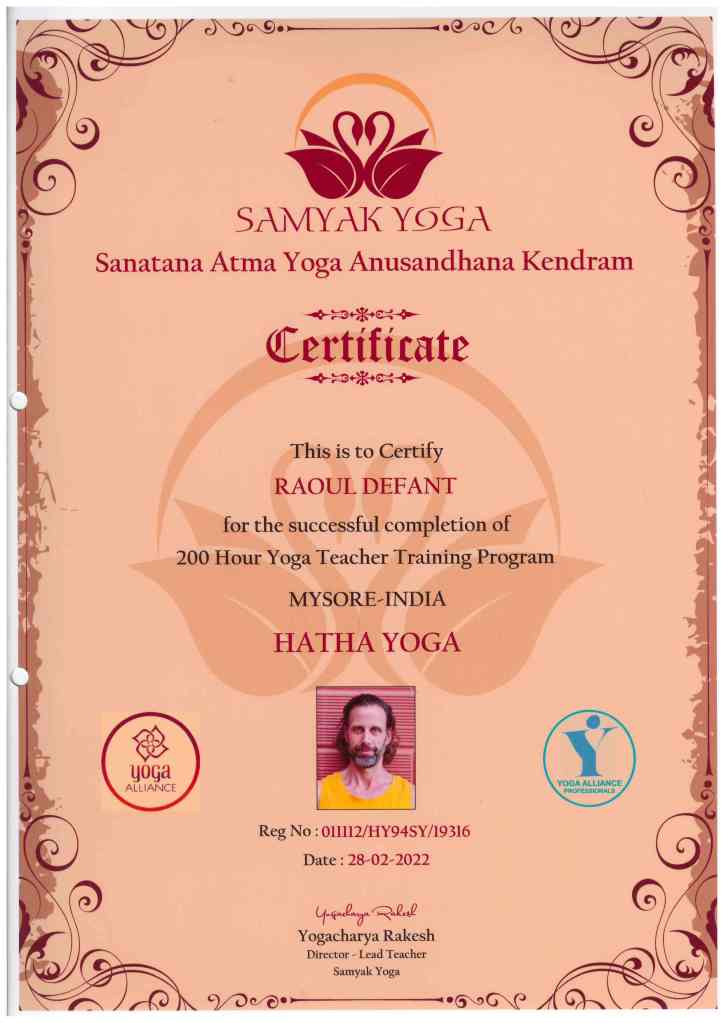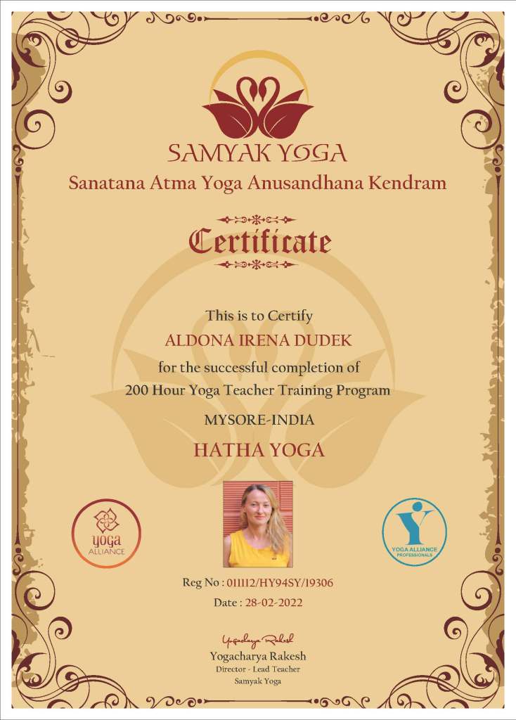 Yogashala Ibiza 2016 – 200 Hours Yoga Teaching Training in Vinyasa Flow Yoga.Kranti Yoga 2019 – 100 hours Yoga Alliance Continuig Education Programm in Yin Yoga.Kranti Yoga 2020 – 300 hours Yoga Teaching Training in Ashtanga Vinyasa Yoga & Vinyasa Flow Yoga.CSEN 2021 – Diploma Nazionale.Andiappan Yoga 2021 – 100 hours Yoga Teacher Training in Prenatal Yoga.Devvrat Yoga 2022 – 200 hours Yoga Teacher Training in Ashtanga Vinyasa Yoga & Hatha Yoga.Devvrat Yoga 2022 – 200 hours Yoga Teacher Training in Ashtanga Vinyasa Yoga & Hatha Yoga.Samyak Yoga 2022 – 200 hours Yoga Teacher Training in Hatha Yoga.Samyak Yoga 2022 – 200 hours Yoga Teacher Training in Hatha Yoga.CSEN 2022 – Diploma Nazionale.World Pace Yoga School 2023 – 300 hours Yoga Teacher Training in Multi Style Yoga.The yoga teachers Aldona and Raoul, from the Samadhi Yoga school of Riva del Garda, at the Ashtanga Yoga school in Mysore in India, with Sharmila Jois granddaughter of Shri K. Pattabhi Jois. / Gli insegnanti di yoga Aldona e Raoul, della scuola Samadhi Yoga di Riva del Garda, presso la scuola di Ashtanga Yoga a Mysore in India, con Sharmila Jois nipote di Shri K. Pattabhi Jois.Ora Raoul e Aldona insegnano da più di 8 anni yoga a Riva del Garda ad Arco di Trento ed in altre località del lago di Garda.