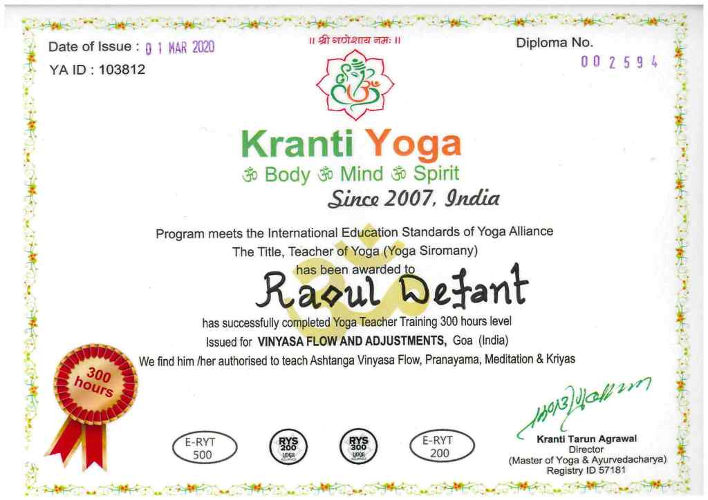 Gli insegnanti di yoga Raoul Defant e Aldona Dudek, della scuola Samadhi Yoga di Riva del Garda, hanno entrambe la certificazione RYT 500 di Yoga Alliance USA, conseguita in seguito alla frequentazione di diversi corsi per insegnanti di yoga. Raoul ha frequentato corsi per insegnanti di yoga per un totale di 1.000 ore, conseguendo diverse certificati per insegnare diversi stili di yoga. Aldona ha frequentato corsi per insegnanti di yoga per un totale di 800 ore, conseguendo diverse certificazioni per insegnare diversi stili di yoga, incluso lo yoga prenatale.